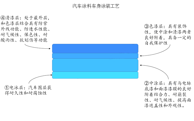 汽车涂装工艺经历了百年发展,其作业方式已由最初的作坊式简单涂刷进化到如今大量流水生产的现代化工业涂装;其作业内容也从仅在需保护的工件表面刷上一层油漆到在工件表面先刷防锈漆再喷面漆发展到现在的“漆前处理——电泳——中涂——面漆”等。当前汽车涂料车身涂层至少包括四层:电泳底漆层、中涂层、色漆层和清漆层。每一层都包含复杂的工艺步骤,且上涂层前要经过脱脂、除锈、磷化等漆前处理,上漆完毕后要对涂装质量进行检测和评判。