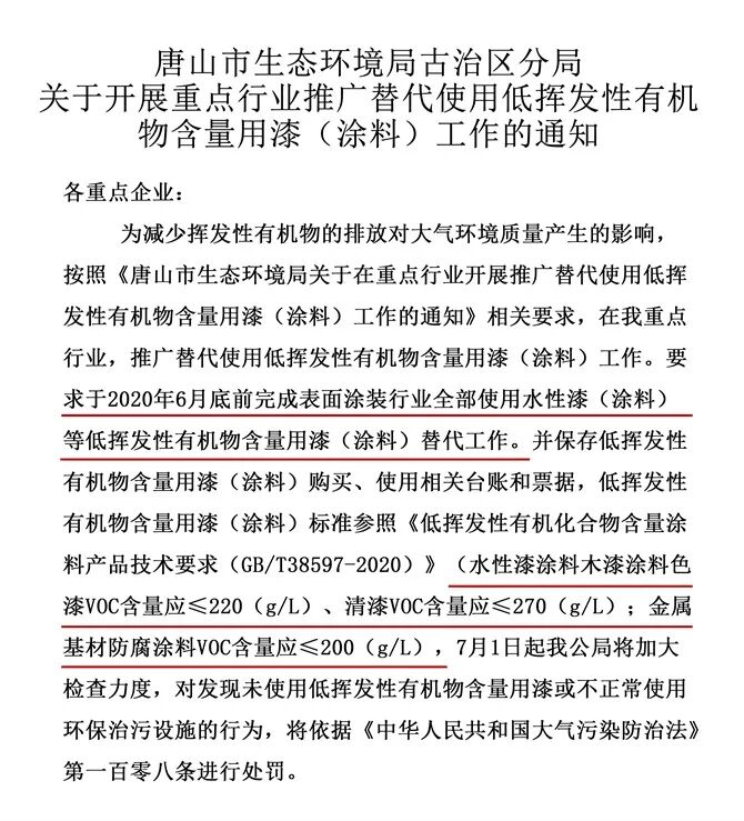 近日河北唐山市生态环境局古冶区分局发布了一则重要通知,明确了使用水性漆的截止日期,并同步了处罚依据。